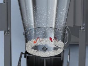 空氣經加熱凈化后,由引風機從下部導入,穿過料斗的孔網板。在工作室內,經攪拌和負壓作用形成流態化,水份快速蒸發后隨著排氣帶走,物料快速干燥。